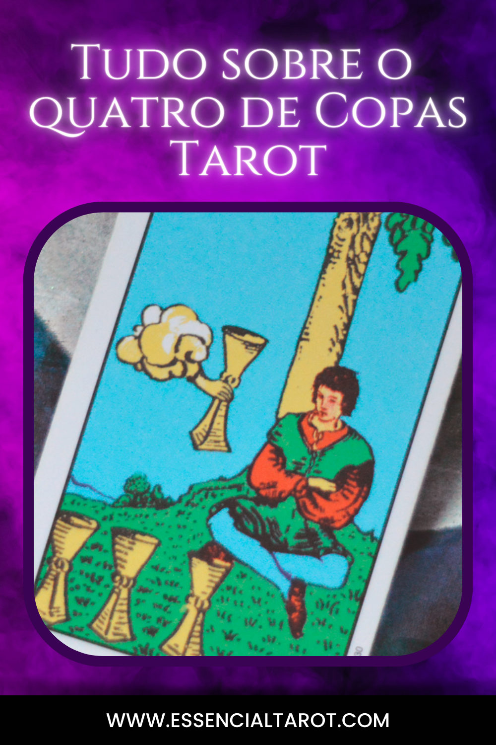 O Quatro de Copas apresenta uma figura sentada debaixo de uma árvore, contemplando três taças alinhadas diante dele, enquanto uma quarta é oferecida pelo universo. É uma cena que evoca a necessidade de reflexão e a possibilidade de descobertas interiores.